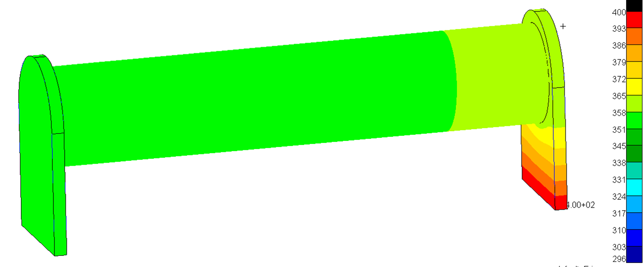 We have a convection coefficient to ambient on all surfaces and a fixed temperature of 400 K at one end. We’ll run a steady state analysis to understand what the temperature distribution will be.