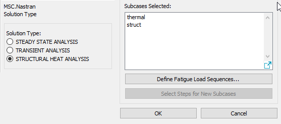 This is set up quite simply in Patran using the Structural Heat Analysis option in the thermal preference by selecting the two cases in sequence.