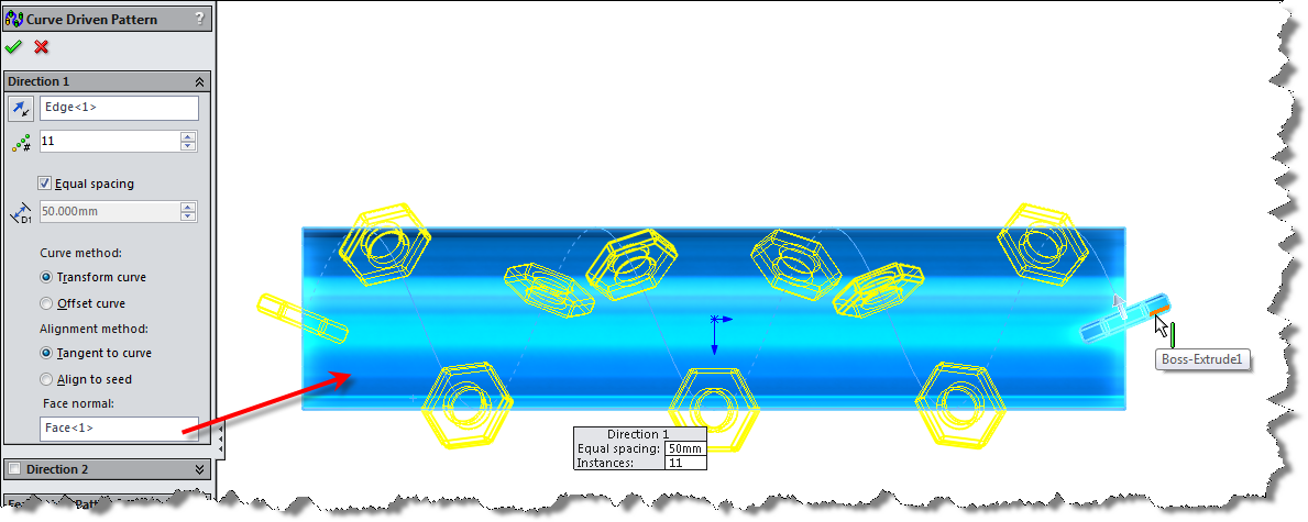 The Curve Driven Pattern is a powerful feature in parts, and now in SolidWorks 2014, assemblies. It allows you to repeat and array features, bodies or parts along a 2D or 3D curve direction, maintaining equal spacing as you go. It is in fact a great alternative to a linear pattern if you use a straight line as the reference sketch- this is the only way to achieve an equal spacing scenario. There is an Enhancement Request to allow equal spacing in a typical linear pattern.