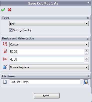 The answer is a right mouse button click on the plot and use the 'Save as' button. This opens up the property manager shown below and allows you to choose from BMP, JPEG and PNG image types as well as VRML and, of course, eDrawings.