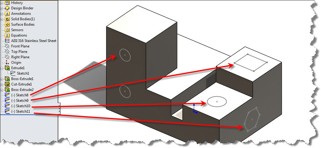 Once you have finished sketching you will notice that Solidworks has created a new sketch for each time you started to sketch on a different face. These can then be used as normal to then complete extrusions or any other feature you wish to create.