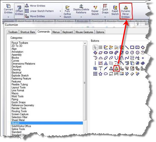 To use this tool, you must first sketch a construction line along the line of symmetry, preselect it, and choose Dynamic Mirror. The command is active until the sketch is exited (you can tell if the command is active by the “=” marks at the top and bottom of the centreline.) If you re-enter the sketch, the command is no longer active, and you must reselect the construction line and run Dynamic Mirror Entities again.